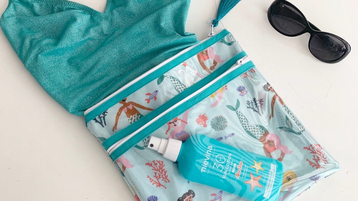 J’ai eu envie de me coudre une petite pochette spéciale piscine ! Elle est double : une poche devant pour lunettes, crème solaire ou autre smartphone bref l’essentiel qui reste au sec ! Une poche principale pour glisser le maillot, le bonnet… ce qui est mouillé après la trempette !